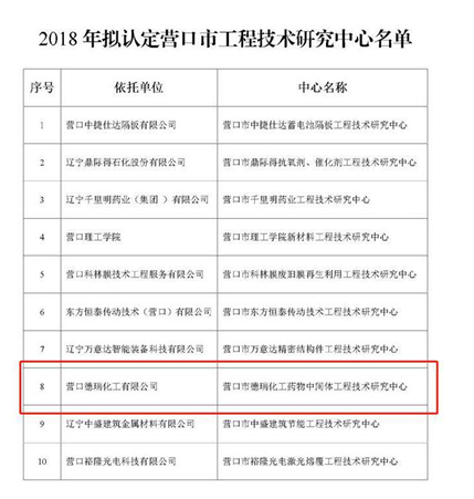 2018年11月9日,營口市科學(xué)技術(shù)局公布了關(guān)于擬認定2018年營口市工程技術(shù)研究中心的公示,依托營口德瑞化工有限公司申報的“營口市德瑞化工藥物中間體工程技術(shù)研究中心”被列入2018年度市級組建計劃中。